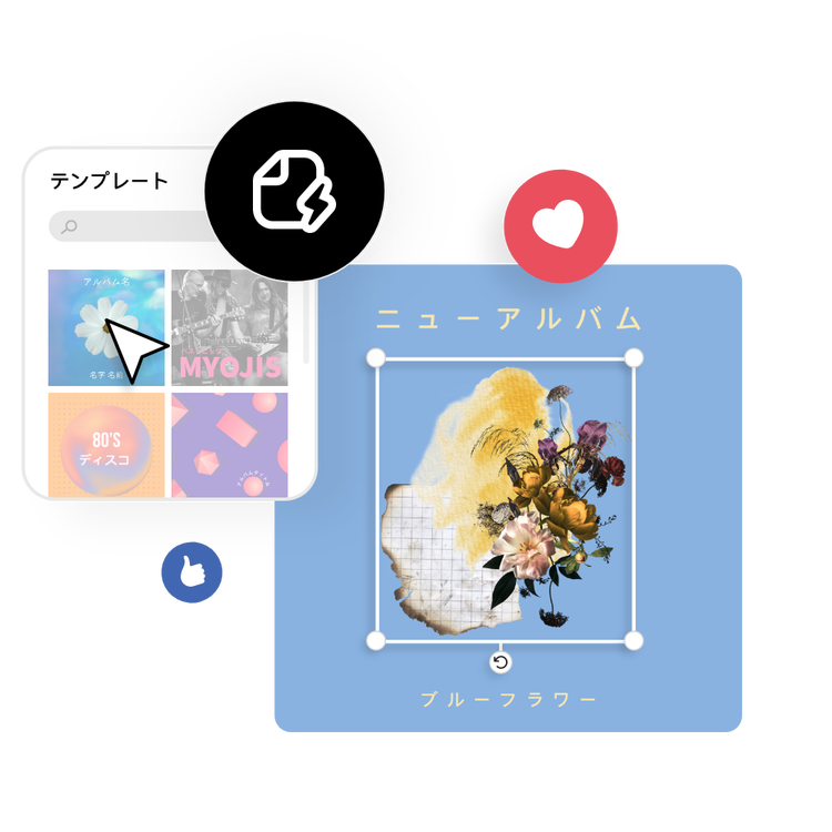 Adobe Expressなら、テンプレートを選び、編集して、できあがったCDジャケットをかんたんに共有できます。わかりやすい画面に従うだけで操作できるのでデザインの経験は必要ありません。たくさん表示されるテンプレートから、アイコン、テキスト、画像、背景などを自由に編集して、アルバムのイメージにぴったりのCDジャケットを作ってみましょう。
