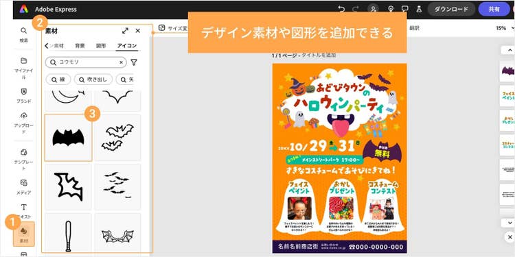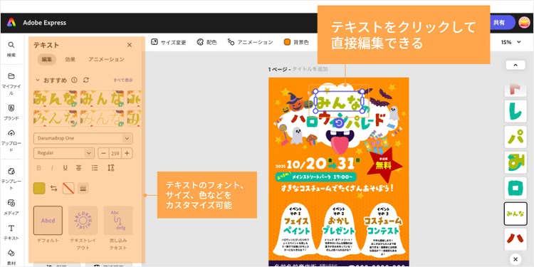 ここからは、チラシデザインにオリジナリティーを加えるAdobe Expressの便利な機能やアイデアをご紹介します。ちょっとした工夫で、思わず手に取りたくなるハロウィンチラシに仕上がるので、ぜひお試しください。