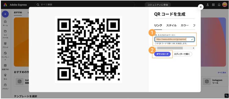 表示されたポップアップ内の入力欄に、QRコードにしたいURLを貼り付けましょう。デザインのテイストに合わせて、QRコードの色やスタイルを変更できます。デザインが決まったら、「ダウンロード」ボタンで保存してください。