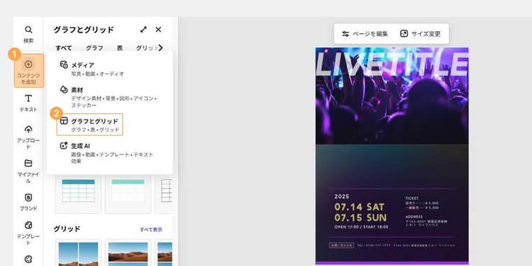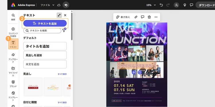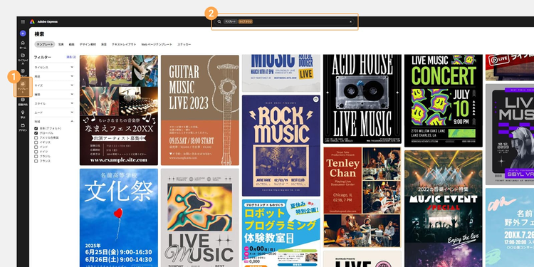 Adobe Expressには、ライブの雰囲気に合う豊富なテンプレートや素材が揃っています。