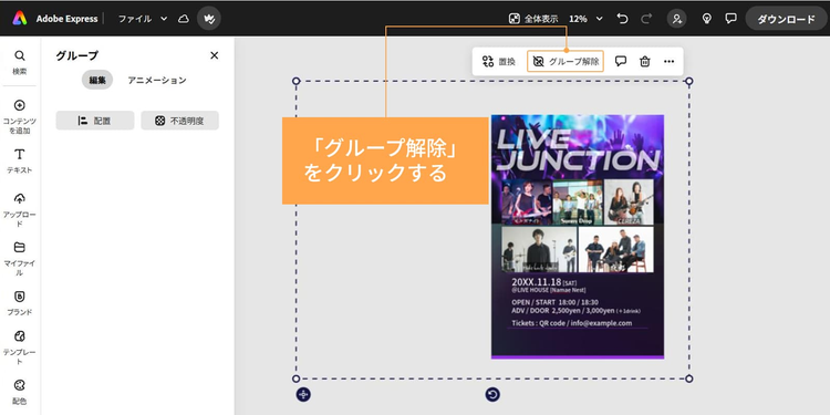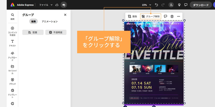 テンプレート上の背景画像がグループ化されている場合は「グループ解除」をクリックします。