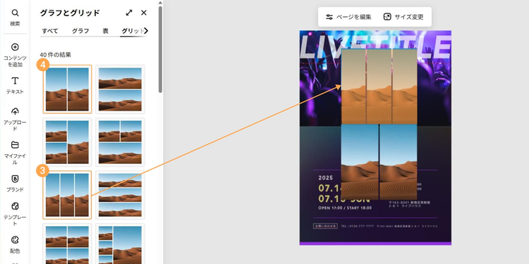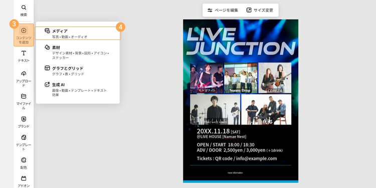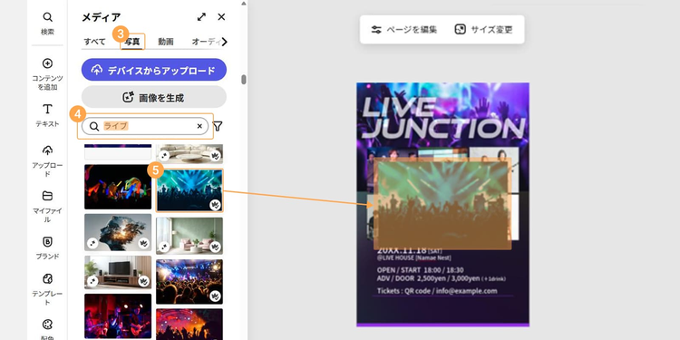 今回は写真素材を追加したいので、「メディア」>「写真」をクリックし、「ライブ」と入力して検索しました。