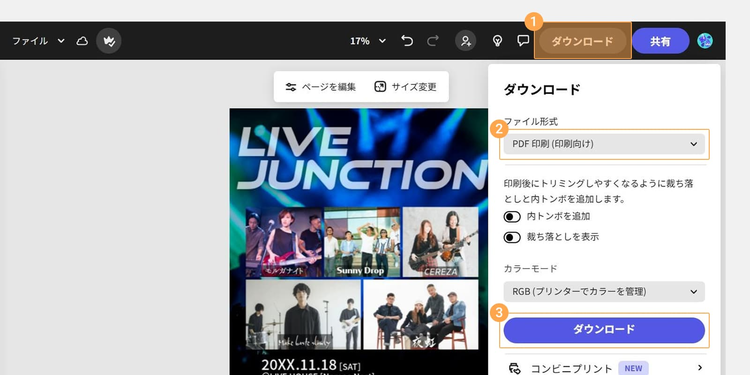 フライヤーのデザインが完成したら、ダウンロードしましょう。