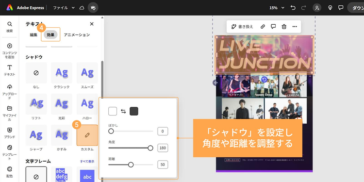 テキストにシャドウ(影)を付けたいときは、「効果」>「シャドウ」を選び、好みのスタイルを設定しましょう。