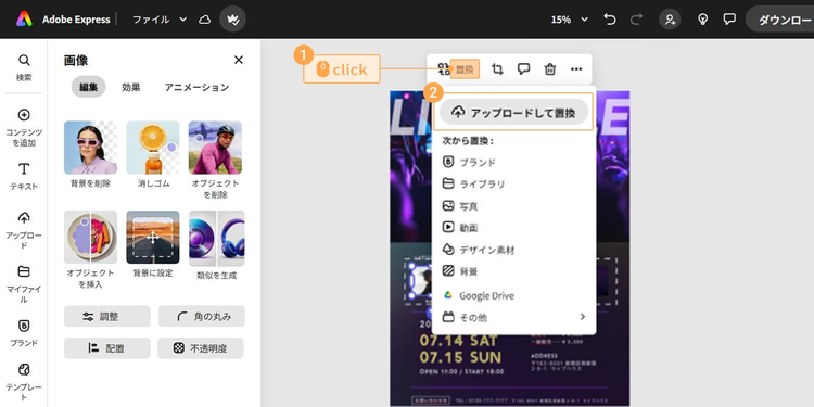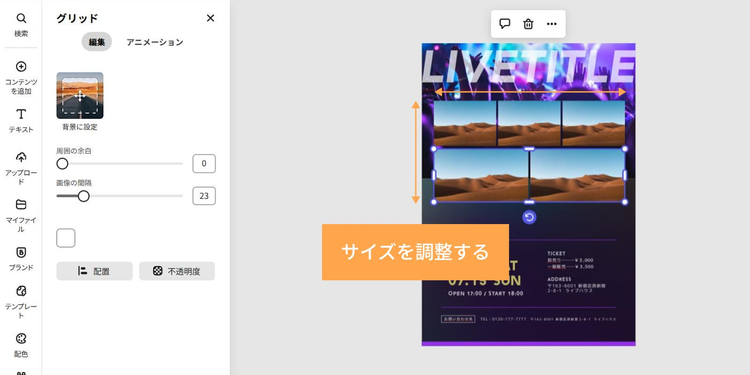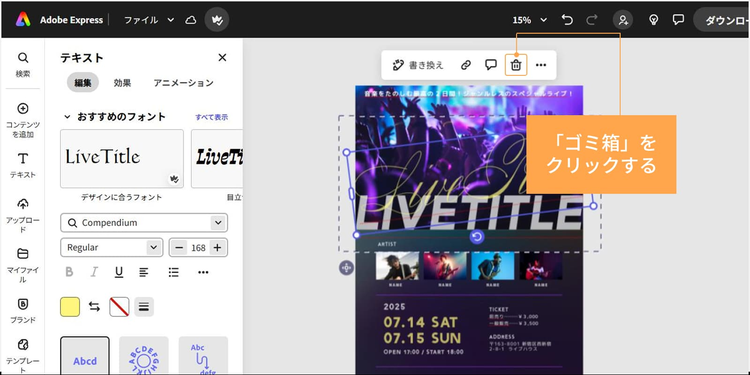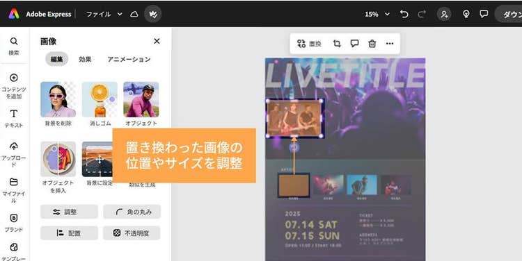 Adobe Express内の素材や画像は商用利用も可能なので、有料イベントの告知にも安心して使えます。