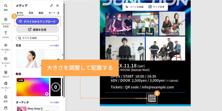 保存したQRコードをデザインに追加するには、「コンテンツを追加」>「メディア」>「デバイスからアップロード」をクリックします。