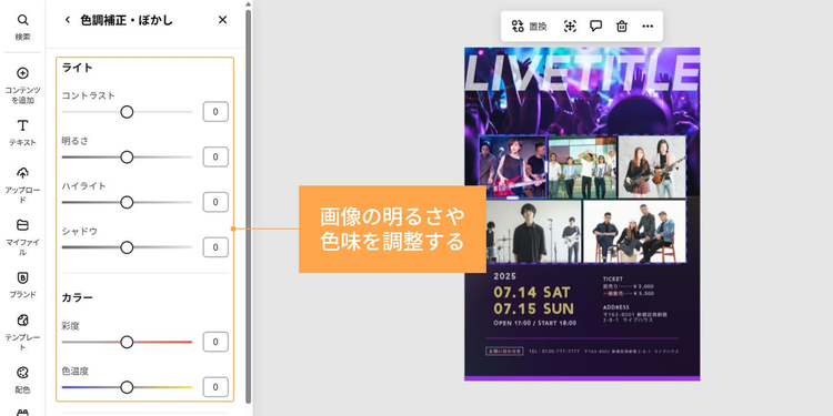 置き換えた画像を選んで「調整」をクリックし、コントラスト、明るさ、彩度などのスライドを動かして好みの色合いに調整しましょう。