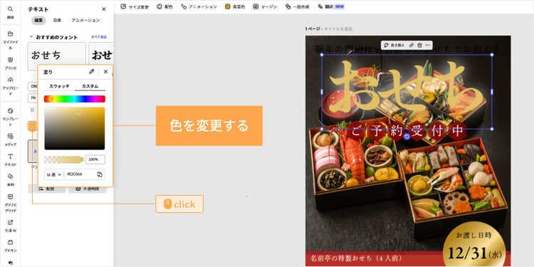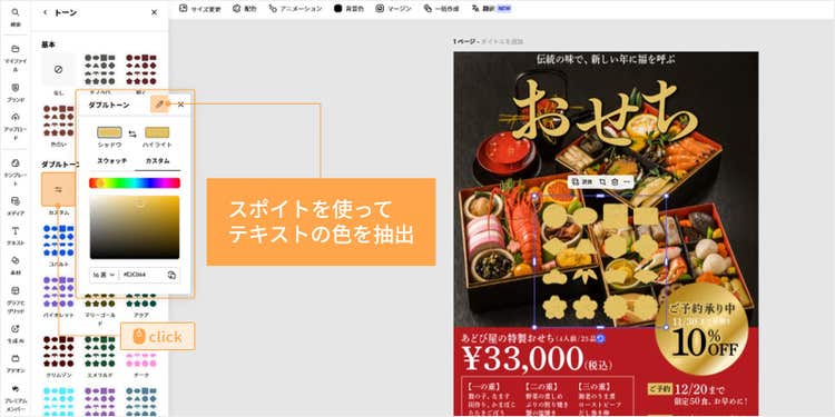 今回は「スポイト」で「おせち」のテキストの色を抽出し、素材に適用しました。