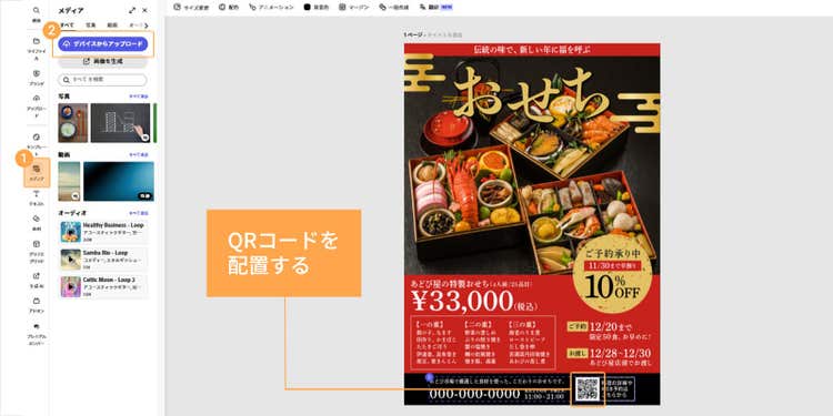 アップロードしたQRコードを配置したら、おせちのチラシのデザインの完成です。