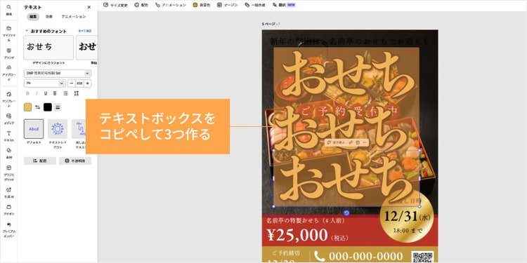 今回はテキストの高さをバラバラに配置したいので、「おせち」のテキストボックスをコピー&ペーストし、同じものを3つ作ります。