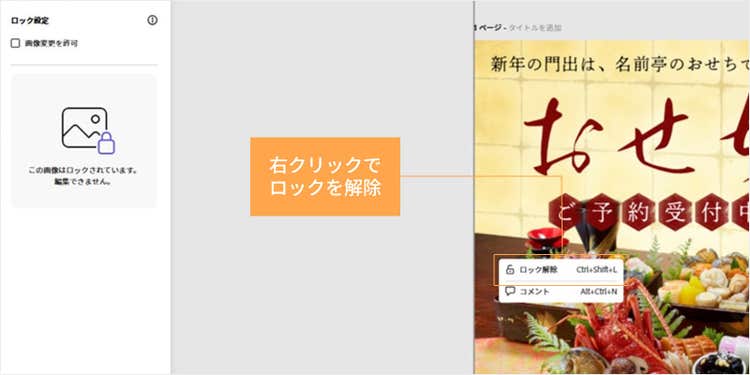 次に、テンプレート内の画像を変更してみましょう。画像にロックがかかっている場合は、右クリックで解除します。