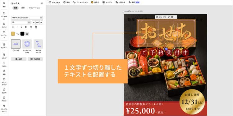 「おせち」のテキストから、それぞれ2文字を削除して、1文字ずつ「お」「せ」「ち」のテキストボックスを作り、配置します。