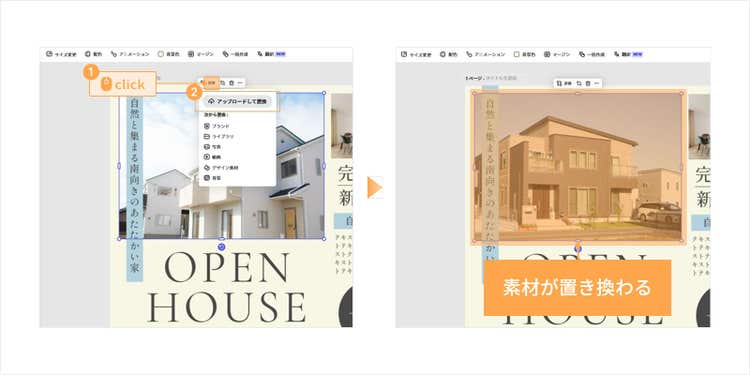 まずは、テンプレート内の画像を変更してみましょう。変更したい画像をクリックし、表示されるメニューの「置換」を選択します。