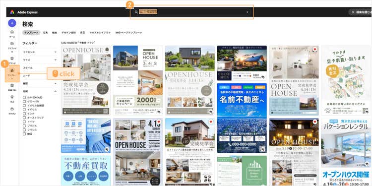 Adobe Expressには、オープンハウスや物件募集、住宅ローン相談会など、不動産関連の用途に対応したテンプレートが数多く用意されています。