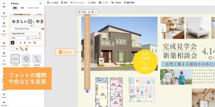 ツールバーからはフォントの種類や色、大きさなどを変更できます。テンプレートの雰囲気に合うフォントが表示されるので、様々なフォントを試しながら、イメージにぴったりなものを選びましょう。