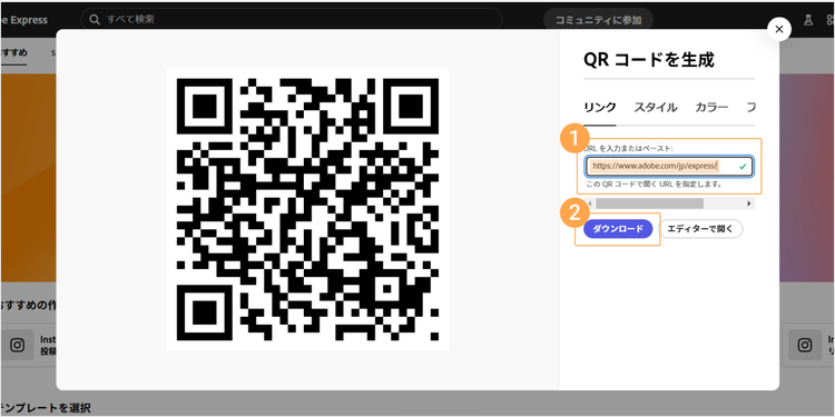 表示されたポップアップ内の入力欄に、QRコードにしたいURLを貼り付けましょう。デザインのテイストに合わせて、QRコードの色やスタイルを変更できます。デザインが決まったら、「ダウンロード」ボタンで保存してください。