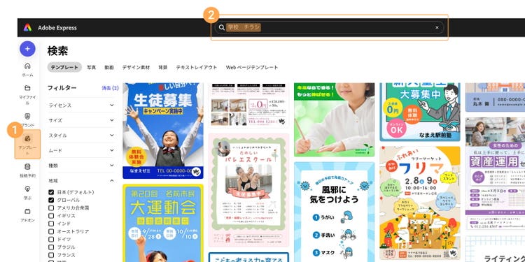 「テンプレート」をクリックし、検索窓に「学校 チラシ」「イベント チラシ」などと入力して検索しましょう。