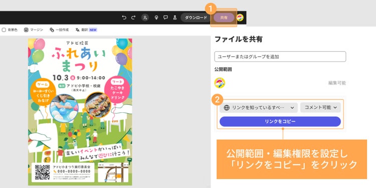 ひととおりデザインの調整が終わったら、文字が読みにくいところはないか、位置がズレていないか、また情報が間違っていないかなどを確認します。可能であれば、Adobe Expressの「共有」機能を活用して、ほかの人に改善点をフィードバックしてもらいましょう。