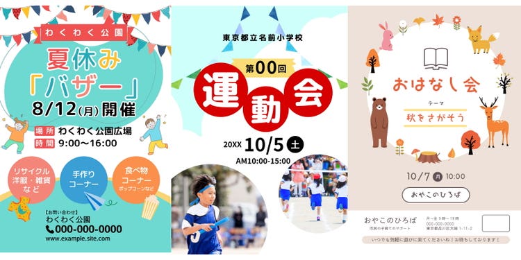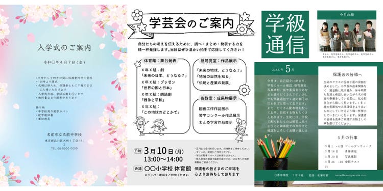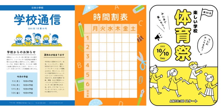 テンプレートやデザイン素材を活用すれば、チラシやおたよりはもちろん、ポスターやスローガンなどの掲示物も手軽に作成できます。