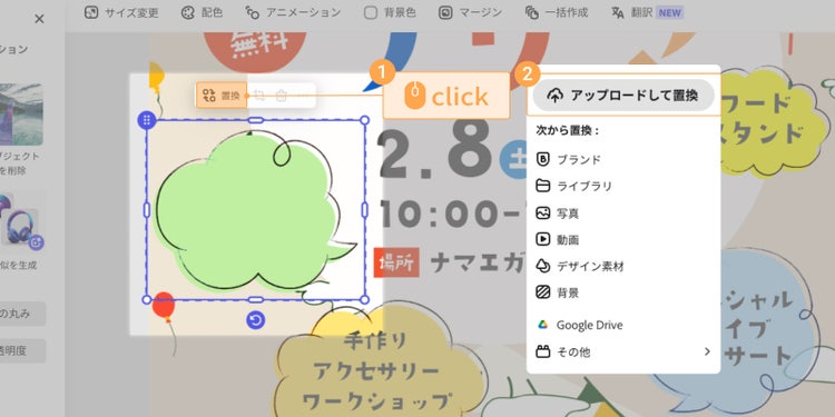 テンプレート内の画像を変更するには、画像をクリックして「置換」を選びます。