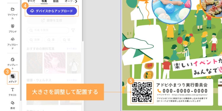 QRコードの画像をダウンロードできたら、【手順3】と同様に「メディア」>「デバイスからアップロード」の順にクリックして配置しましょう。
