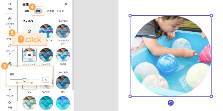 画像の明るさや色合いを調整したい場合は、「効果」から「フィルター」や「トーン」を使ってみましょう。