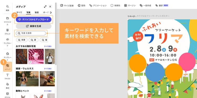 Adobe Express上の素材を使う場合は、「写真」や「デザイン素材」をクリックし、検索窓にキーワードを入力して素材を探します。