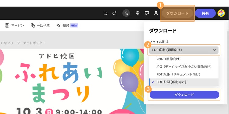 Adobe Expressで作成したデザインは、画像ファイルやPDF形式でダウンロード可能です。