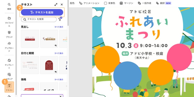 それでは、実際にAdobe Expressのテンプレートを編集しながら、チラシを作成してみましょう。