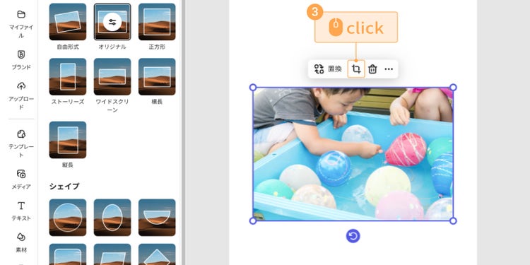 画像を選択した状態で、「切り抜き」アイコンをクリックすると、ハートや星などの複雑な形も、テクニックいらずできれいに切り抜けます。