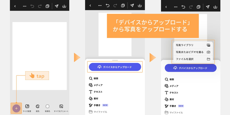 下部の「+(プラス)」ボタンをタップし、「デバイスからアップロード」から写真をアップロードします。