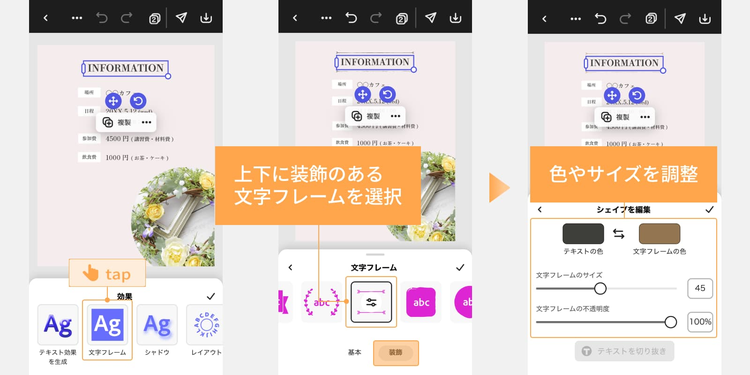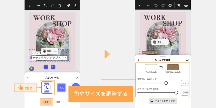 雰囲気に合う文字フレームを選択し、色やサイズを調整しましょう。