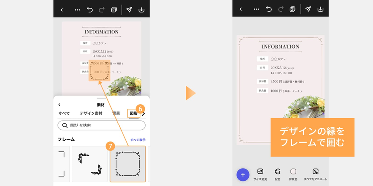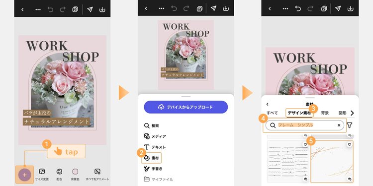 下部の「+(プラス)」ボタンをタップし、「素材」から「デザイン素材」や「図形」を選択して検索窓に「フレーム」「ライン」など、イメージに合うキーワードを入力します。