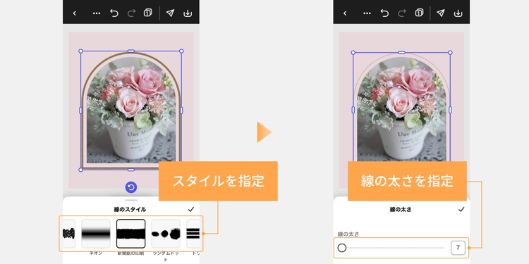 - 素材を選択し、「枠線」から好みの色を選びます。次に「スタイル」をタップして線のスタイルを選びます。使いたいものをタップすると、素材の縁にアウトラインが付きます。