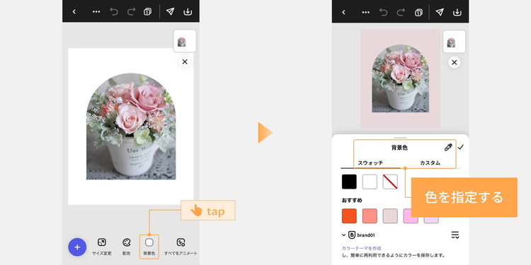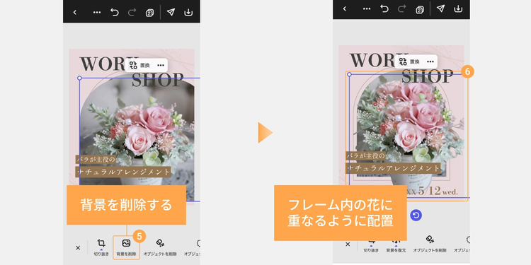 切り抜きが完了したら、「背景を削除」をタップして背景を削除し、フレーム内のフラワーアレンジメントにぴったり重なるように配置します。