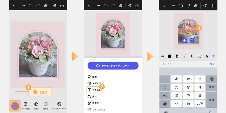 「+(プラス)」ボタンをタップし、「テキスト」を選んでテキストを入力します。色やフォント、サイズを調整し、素材の上に配置します。