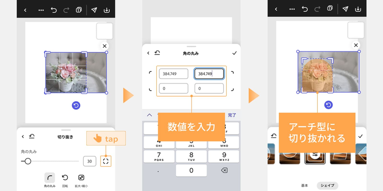 今回は、窓枠のようなアーチ型のフレームに合わせてトリミングするために、「シェイプ」の角丸の正方形を使用しました。