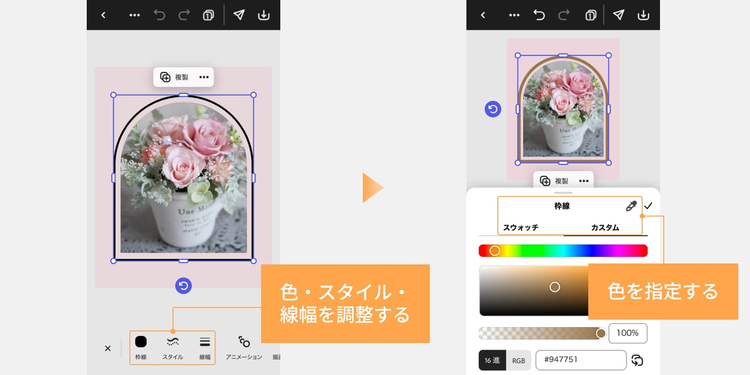 写真の周囲に配置したら、画像に合うように指でサイズを整え、色・線のスタイル・線幅などを調整します。