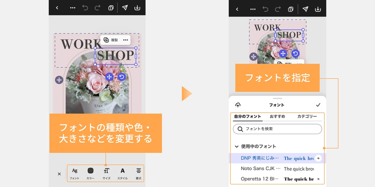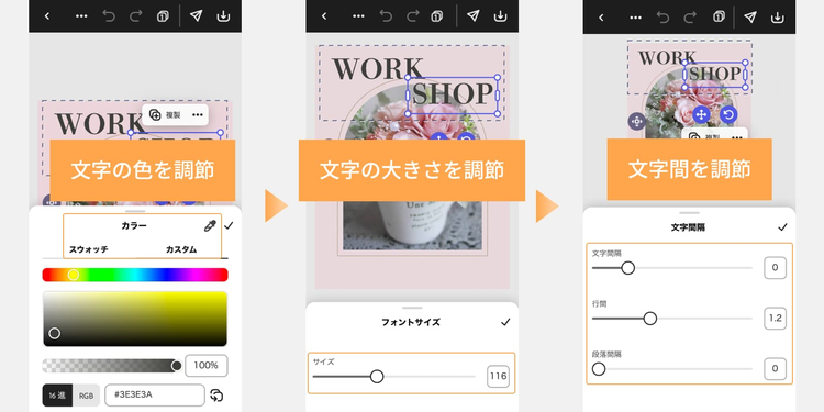 テキストを入力したら、フォントの種類や色・大きさ・文字間などを調整しましょう。