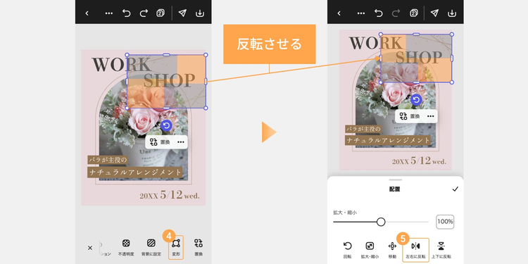 フレームを画面の右上と左下に配置するため、素材を左右に反転させたい場合は、「変形」をタップし、「左右に反転」を選択します。