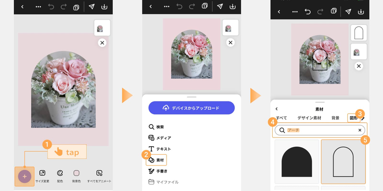 - 「+(プラス)」ボタンをタップし、「素材」から図形やイラストを選びます。使いたい素材をタップすると、自動的にカンバスに追加されます。
