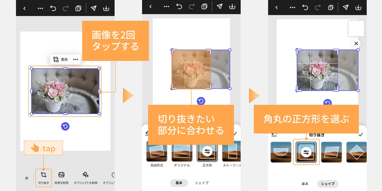 - 「切り抜き」をタップし、図形よりもひと回り小さな同じ形に切り抜きます。指で拡大・縮小し、縦横比を保ったまま写真を図形の上に配置します。