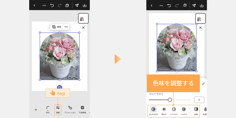 写真の色味を調整したい場合は、画像全体を選択し、「調整」をタップします。