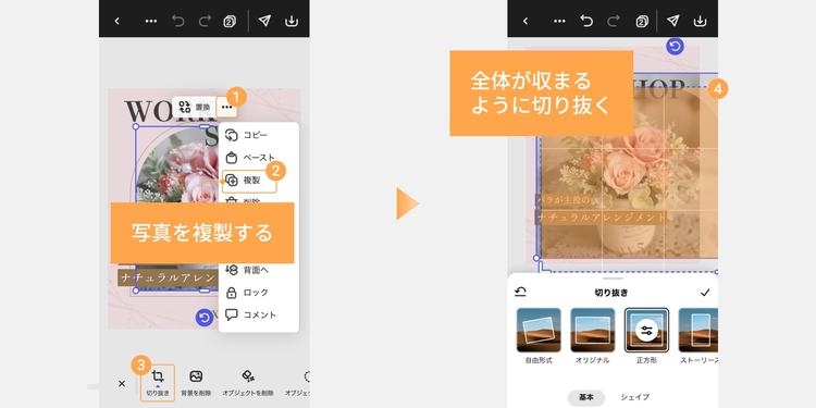 まず、メインで使用している画像を「…(その他)」アイコンから複製し、フラワーアレンジメント全体が収まるように切り抜きます。