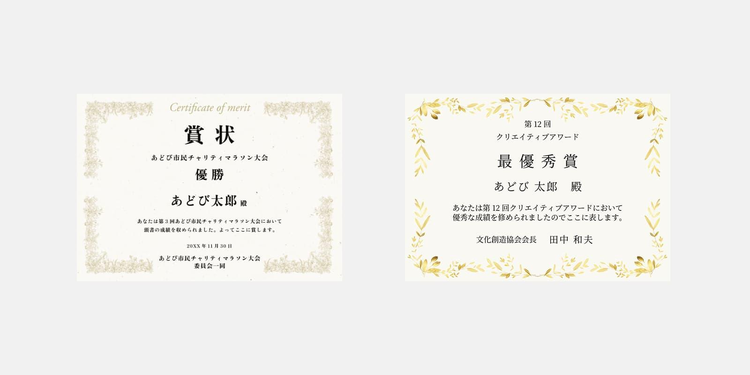 さらに、ゴールドやシルバーのアラベスク柄やヴィンテージ風のリーフ柄、幾何学模様などのフレームを配置すれば、上品で格式のある印象になり、賞状・表彰状・フォーマルな案内状などに最適です。