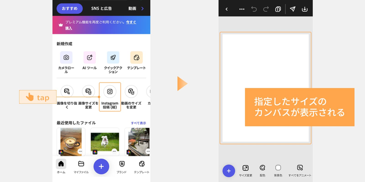今回はInstagram投稿を作成するので、ホーム画面のメニューから「Instagram投稿(縦)」をタップしましょう。