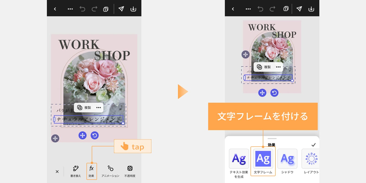 テキストにフレームを付けたい場合は、「効果」>「文字フレーム」をタップします。