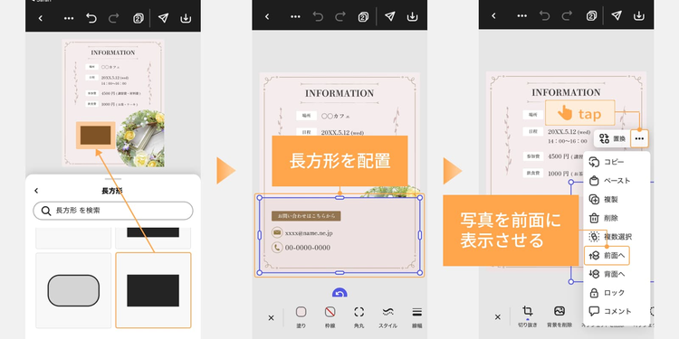 ワークショップ情報はデザインの背景の上に直接テキストを載せ、問い合わせ先は「素材」>「図形」から追加した長方形の上に載せています。