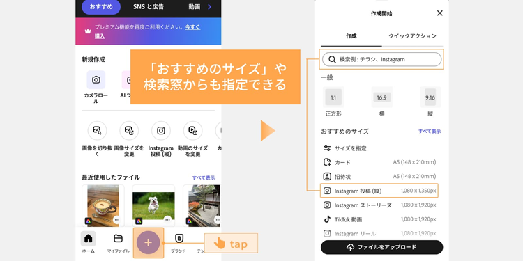 ほかには、「+(プラス)」ボタンをタップし、「おすすめのサイズ」から選んだり、検索窓に「Instagram」と入力したりしてサイズを指定することも可能です。