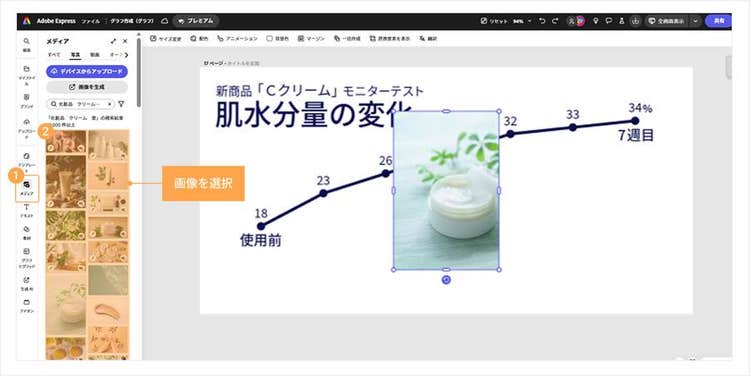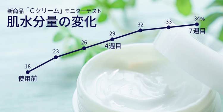以下の画像は、「化粧品のモニターテストによる肌水分量の変化」を示す折れ線グラフの背景に、化粧品のイメージ写真を配置することで、内容とビジュアルのつながりを直感的に伝えた例です。